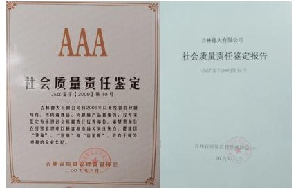按照《吉林省社會質(zhì)量責(zé)任優(yōu)秀單位鑒定規(guī)則》規(guī)定,由企劃部申報(bào)的分割雞肉、雞肉調(diào)理品、火腿腸產(chǎn)品,于2009年8月順利通過專家鑒定,獲吉林省社會質(zhì)量責(zé)任AAA優(yōu)秀單位稱號。